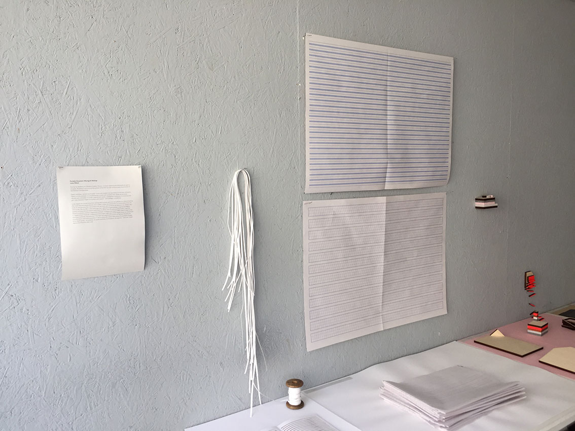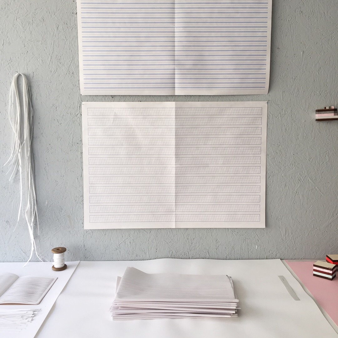 Paper mobilises, connecting its users’ voices with readers and spectators across time and space. Paper is multi-purpose: it is simultaneously ancient yet contemporary, cheap yet priceless, durable yet vulnerable; it is both originals and copies, classlessness and luxury; it constrains and yet it also liberates. Paper is a surface and a space – and perhaps, a prosthesis. | In the digital era, as we move from writing with fountain pens on real surfaces, to a form of writing that exists beyond physicality (no ink or paper, unless we press print), I’m curious about how we think of and perceive this new surface that we write upon and how we behave in its witness. As a child of the 70s and 80s, in the same way that I grew up caught between Imperial and Metric systems of measurement (never quite fluent in either, sort of understanding both), I now find myself in a similar position: suspended between analogue and digital. What does it mean to live in ’digital times’? How do I understand what paper might be in these digital times via manual and analogue methods of production? The tests and experiments shown at Old Bank Studios are considerations and starting-points in how to physically realise ideas about the qualities of paper in its digital guise – its mobility, its spatial qualities, its limitations, its expanse – and how I might repurpose these for other acts. |
