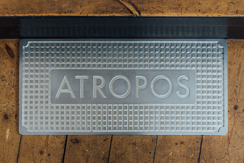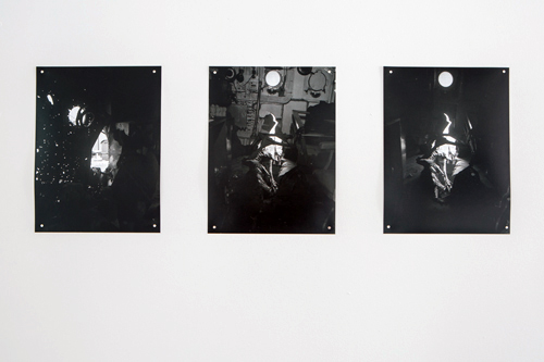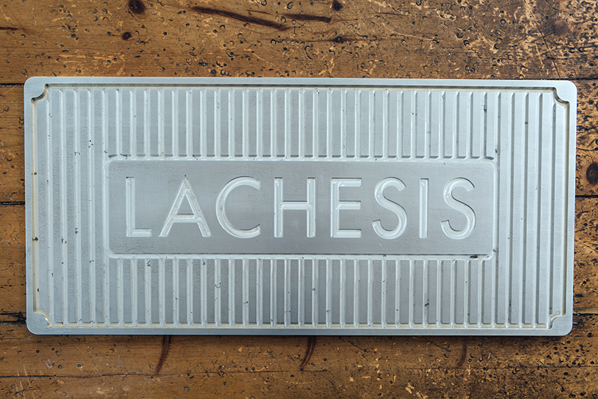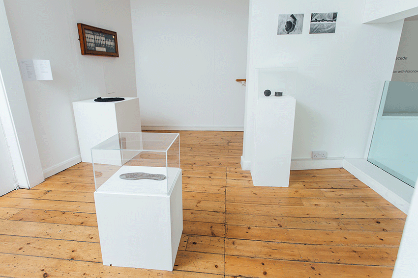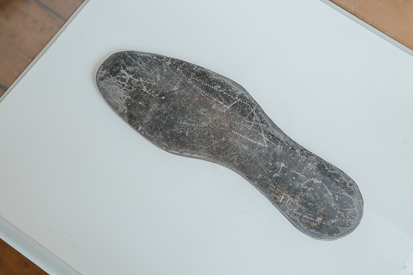 The three gallery spaces: Clotho, Lachesis & Atropos | Atropos (The Unturning) Treadplate [CNC milled aluminium sheet] | Lead footprint [From a diver’s suit]. Believed to be 1940 but no accurate records |