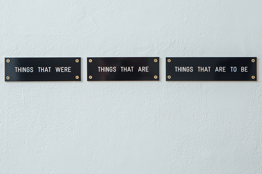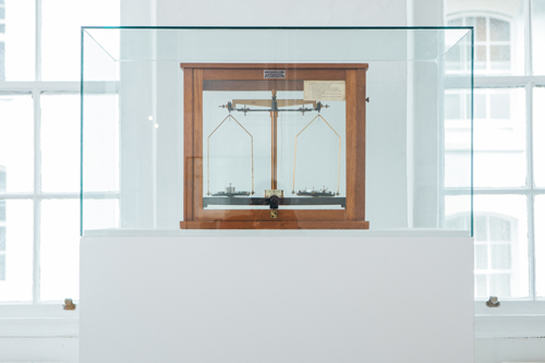 The Measure of a Man I (4 Fathoms) [Wool from one disassembled navy surplus pullover, spun into rope] | Creation of The Measure of a Man I (4 Fathoms) | The Measure of a Man II (For Herbert) [Electroformed copper feather, equivalent weight of coal grains on hanky] | 50000 x 1 mm wound Helios wool from naval jumper & 35mm orthographic film 9400 x 35mm wound film | Things That Were / Things That Are / Things That Are To Be [CNC Engraved Traffolyte] | Exhibition guide pages | Lachesis (The Allotter) [CNC milled aluminium sheet] | Brass Measures. Dated from 1721 | Hurt books I, II, II. Dated 1888–1891, 1902–1903, 1913–1914 | Set of Scales | Rations [Vacuum packed foodstuffs]. Believed to be 1971 but no accurate records |