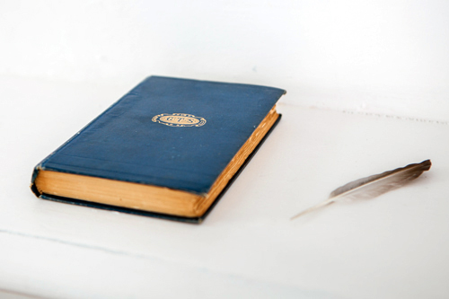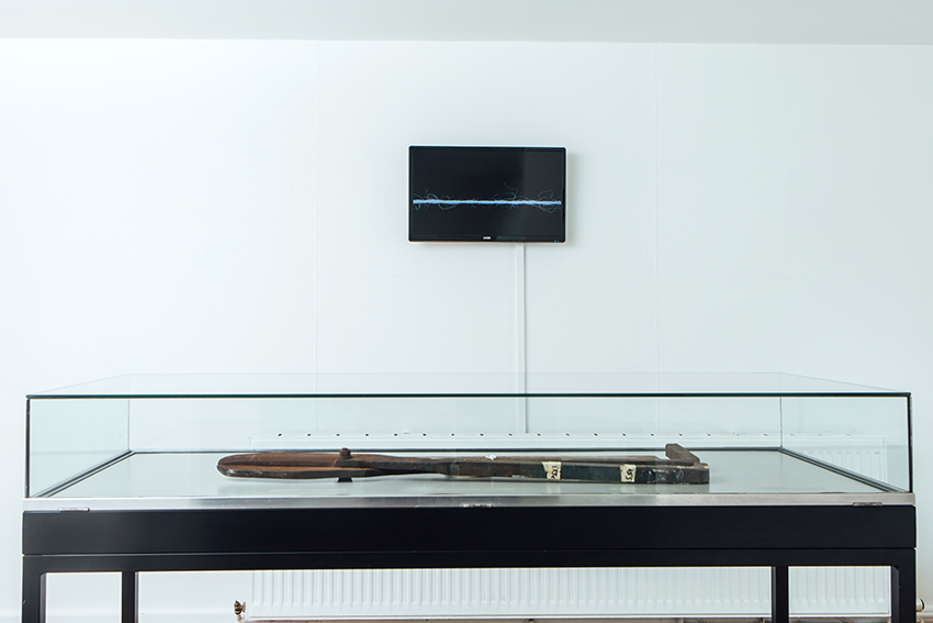 While making the film Quercus Regius: 00:58-01:29 in the darkroom, the artists assumed the roles of the Fates, blindly unravelling, measuring and cutting the unwound wool from the previously mentioned ex-Government naval jumper, and placing it on light-sensitive film, the animated duration of which corresponds to that of the sinking of HMS Royal Oak (the warship was built in Devonport). | In keeping with the theme of measuring, displayed in the Atropos space, but also refering to the collection of Hurt Books in Lachesis, was our own interpretation of a Hurt Book. The Hurt Books from Devonport record health and safety incidents at the docks, both major and insignificant. Handwritten, they form a document of the volume human of damage on site. Our interpretation of this material was a Hurt Book of our own, measuring the cutting capabilities of DNHCs knife collection. Each knife on display was used to attempt to cut a sheet of paper. Many were ineffective, merely leaving scores, rustly lines or partial cuts. Hurt Book is a book documenting these (inconsequential) incisions.