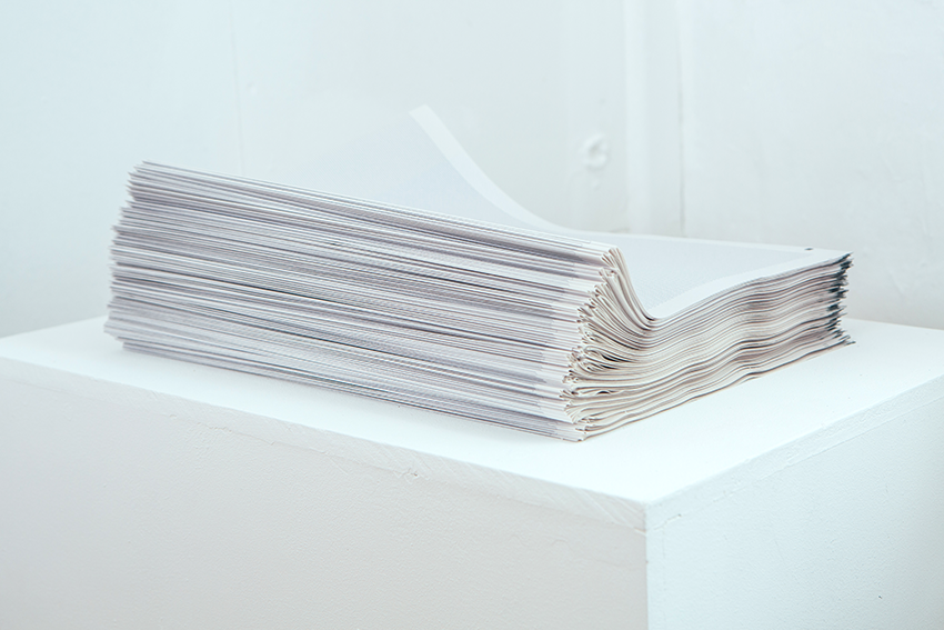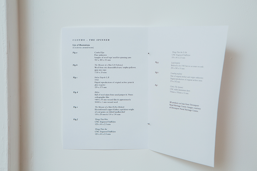 From our first visits to DNHC, we were struck by the quantity of items that established consistency, systematization and uniformity: from mess utensils regulating portion sizes, to photographs documenting damage to ships from enemy fire. In response, the curation of artefacts and new works is framed by these notions of measuring, quantifying, delineating and assessing, symbolised in the exhibition by the ancient Greek myth of the Fates, or Moirai. These three female deities were charged with spinning, measuring and cutting the thread of life. The exhibition was organised within these jurisdictions: Clotho, the Spinner; Lachesis, the Allotter and Atropos, the Unturning. Each of the three sections of the exhibition was demarcated by a specially created 'treadplate', depicting the name of the deities, referencing the ship's treadplates in the DNHC collection. The exhibits in each space examined the themes associated with that given Fate. | Through a process of reduction – both literal and semantic – we interrogated the materials, processes and words used in the responsive works, paring down to their essential properties or etymology. Belli Dura Despicio [Broadside] considers the multiple meaning of the word ‘broadside’, as a description of a position, an action, a measurement and a print-term. In its complete edition of 150 broadside newsprint sheets, Belli Dura Despicio [Broadside] is a 29.7km line printed on 150 broadside newsprint sheets. 29.7km relates to the maximum distance of a broadside from Warspite's 15" guns (in this instance a broadside refers to a firing of all the guns from one side of a warship).