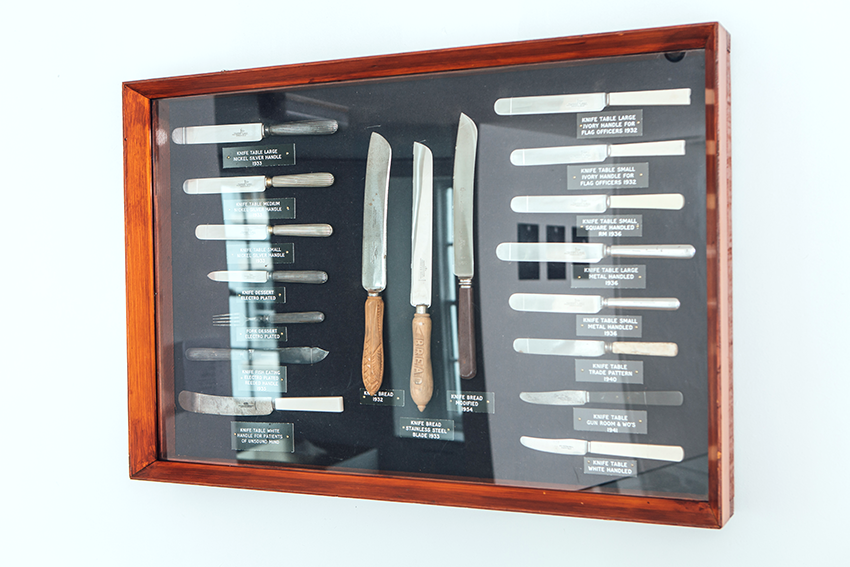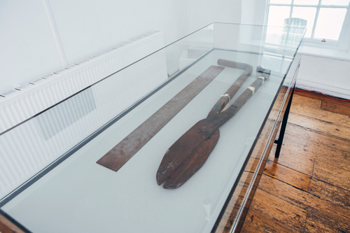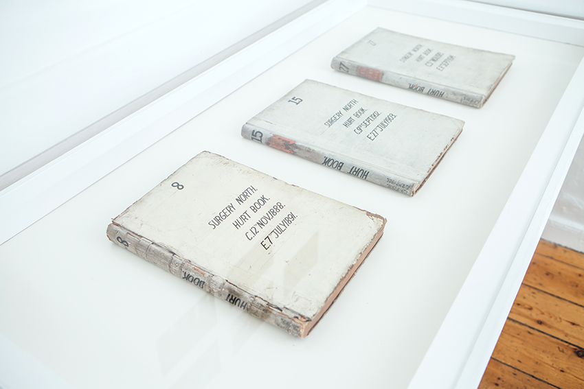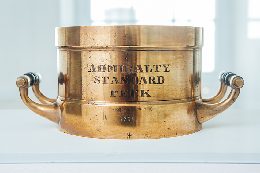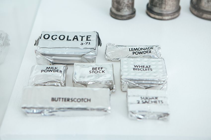 Tanks & Tablecloths: Chapter Two explored the archives of Devonport Naval Heritage Centre (DNHC), relocating original artefacts and presenting these alongside new works in the gallery of Plymouth Arts Centre. The exhibition was a test-ground for our experimental concept of ‘an exploded book’: an attempt to define how a work might be ‘read’ in space, using four-dimensional inter-relationships between text, subject and object. | DNHC holds a military collection which records the development of the dockyard and Plymouth’s role in the Royal Navy. It houses a large collection of ‘victualling’ artefacts from the Royal William Yard in Stonehouse. This vast facility, designed by Sir John Rennie and completed in 1831, became the major provisioning, or ‘victualling’, depot of the Royal Navy. Supplies for the Royal Navy were stored at the Yard, including equipment, food rations and clothing.