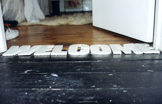 nstructions for use: 1. Choose an appropriate doorway or step for your Welcome stencil. 2. Sprinkle chalk dust/cocoa/dust removed from your vacuum cleaner liberally over the surface. 3. Remove stencil carefully to avoid disturbing dust. 4. Observe as people pass over your Welcome, inadvertently destroying one artwork and creating another. |